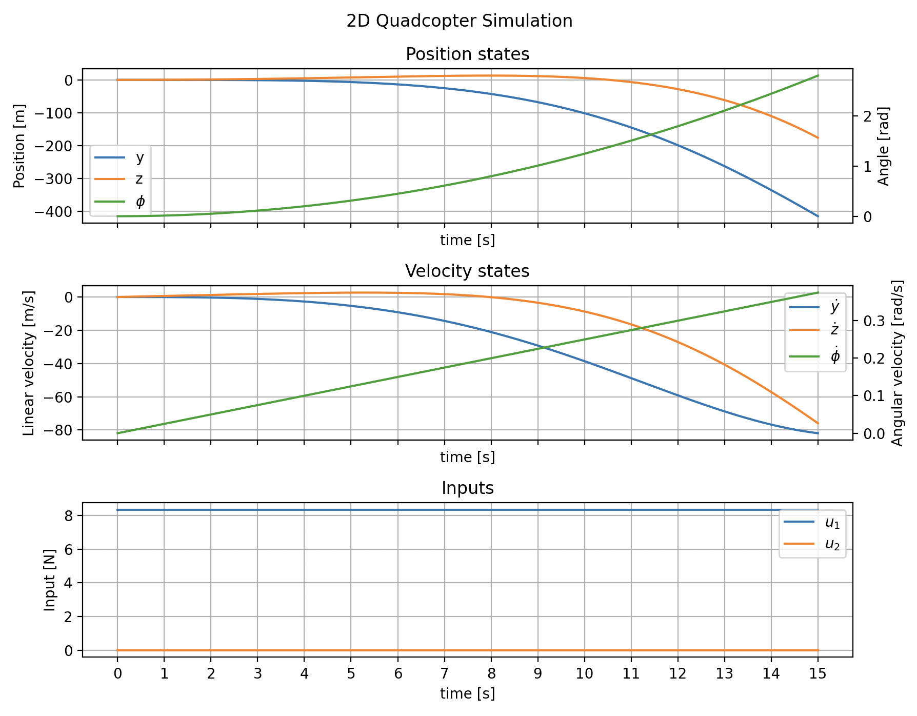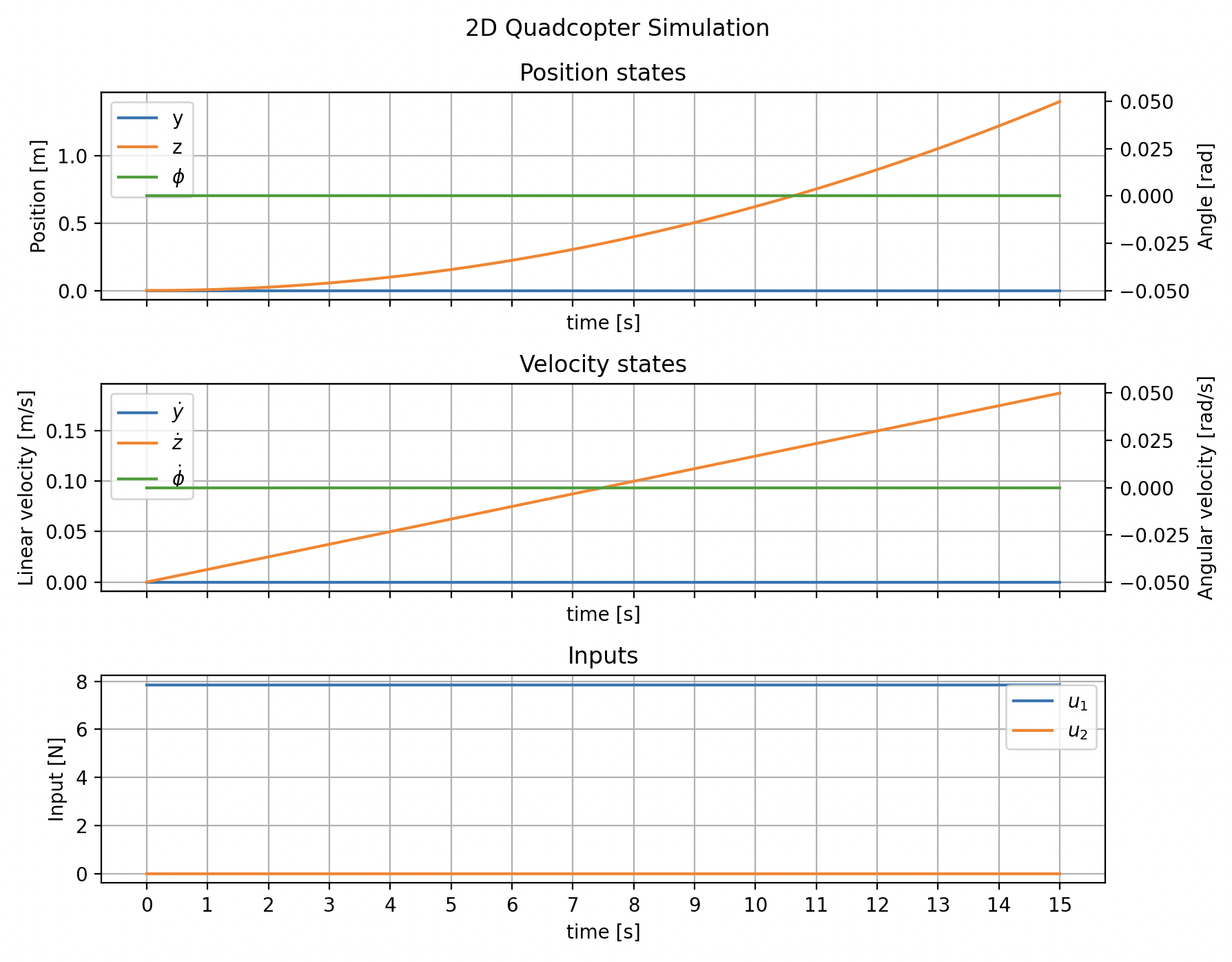 We confirm that our simulation performs as expected with the plot shown below. As expected, the \(y\) position and \(\phi\) angle stay constant, as well as their respective velocities \(\dot{y}\) and \(\dot{\phi}\). In this constant-input, zero-torque case, the vertical acceleration is constant, so the \(z\) position grows quadratically and the \(\dot{z}\) velocity grows linearly.